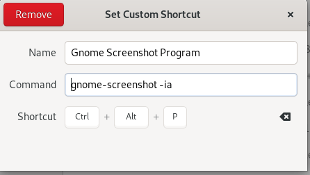 - In the Set Custom Shortcut screen, set the Name, Command and Shortcut as shown below. Note that the -ia flag sets the program to start interactively and defaulted to area selection respectively.